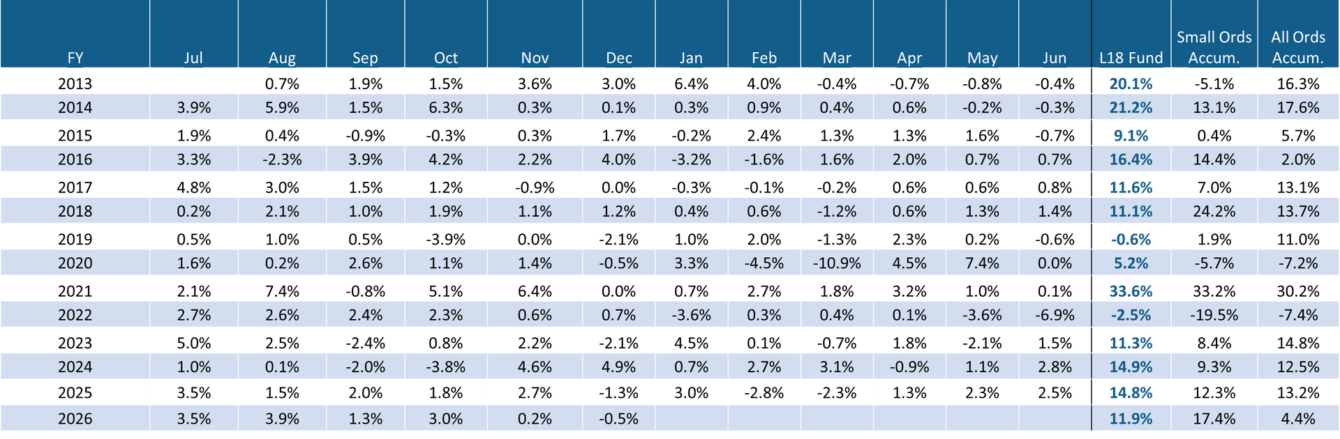 Since inception (2012), the Fund has delivered a +13.0 per cent net return per annum versus the All-Ordinaries Accumulation Index at +10.0 per cent and the S&P/ASX Small Ordinaries Accumulation Index at +7.5 per cent. The Fund’s flexible mandate has been designed to protect capital in correcting markets and deliver performance in rising markets.