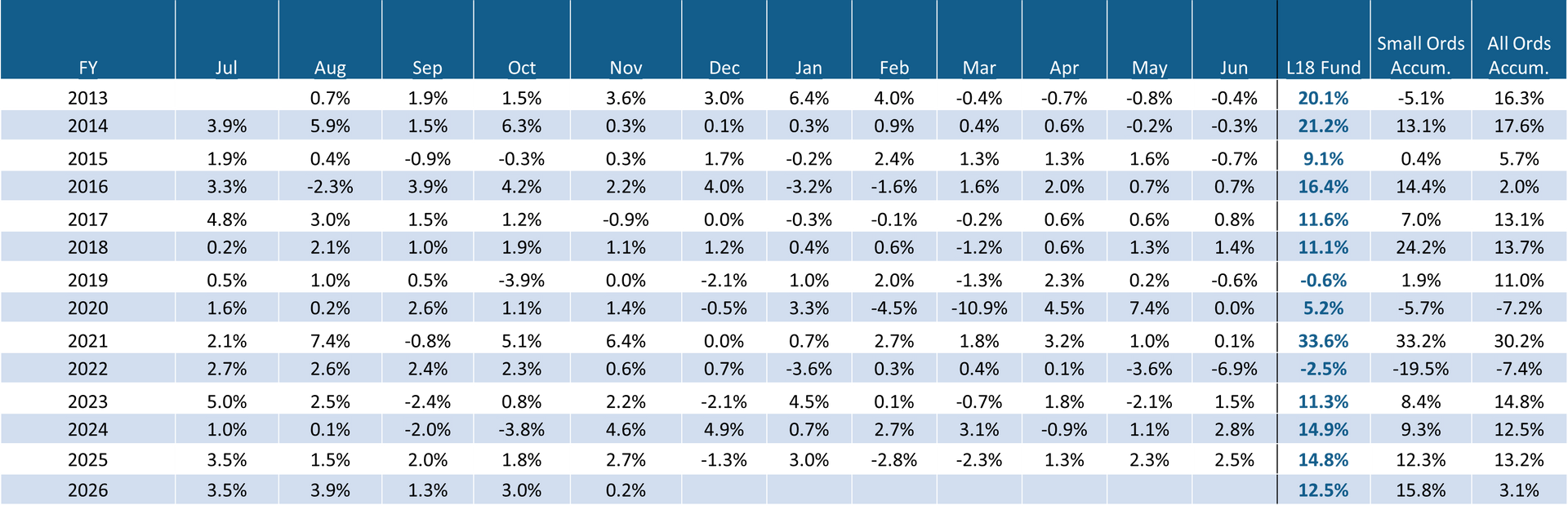 Since inception (2012), the Fund has delivered a +13.1 per cent net return per annum versus the All-Ordinaries Accumulation Index at +10.0 per cent and the S&P/ASX Small Ordinaries Accumulation Index at +7.4 per cent. The Fund’s flexible mandate has been designed to protect capital in correcting markets and deliver performance in rising markets.