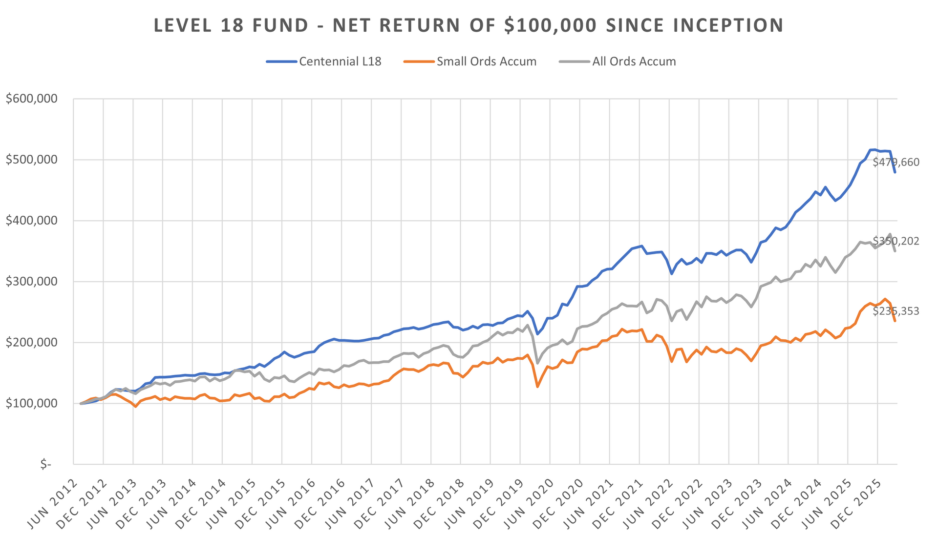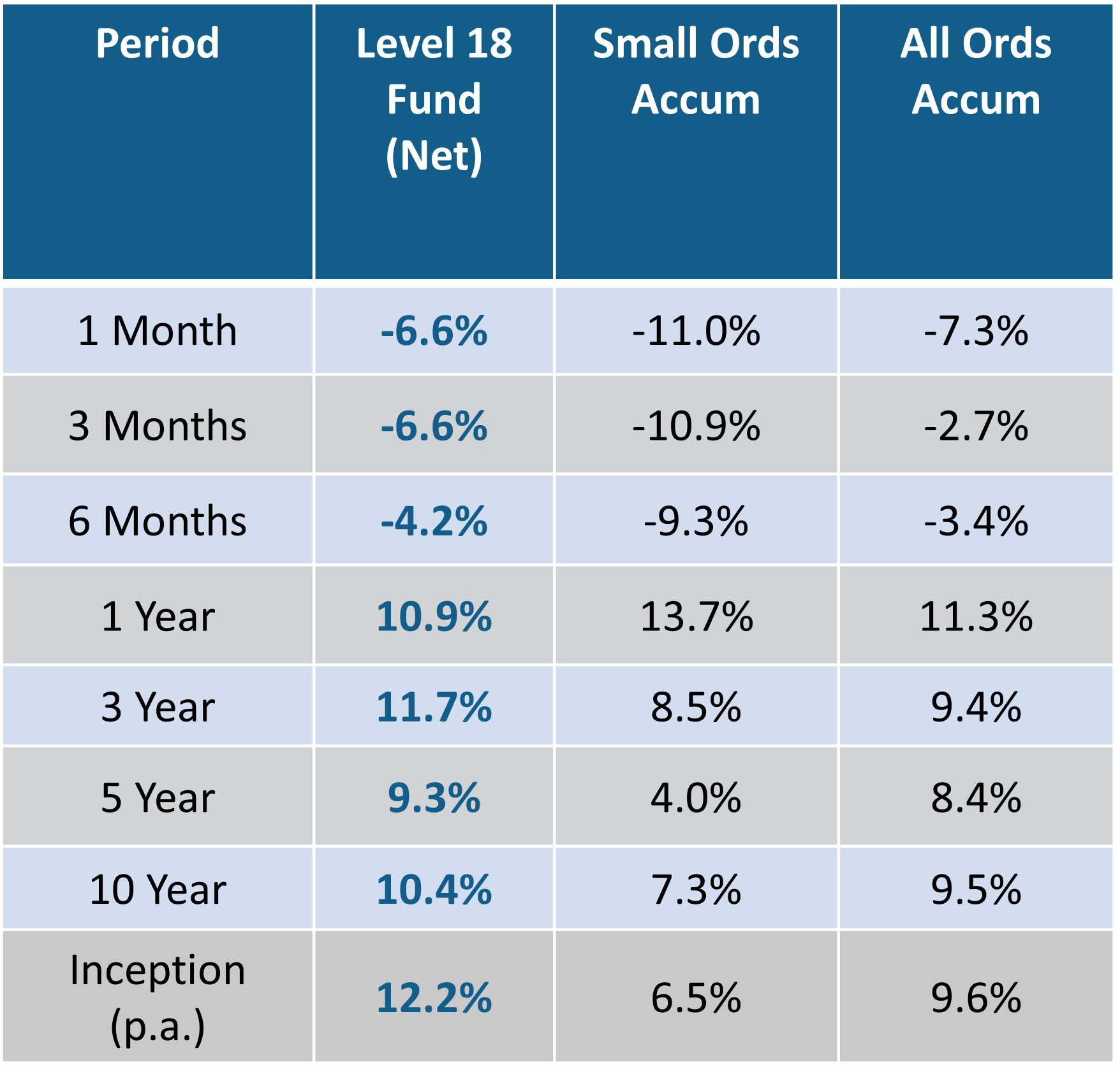 The Level 18 Fund decreased by -6.6 per cent net of fees for the month. For the 12 months to March 31, 2026, the Fund increased by +10.9 per cent.