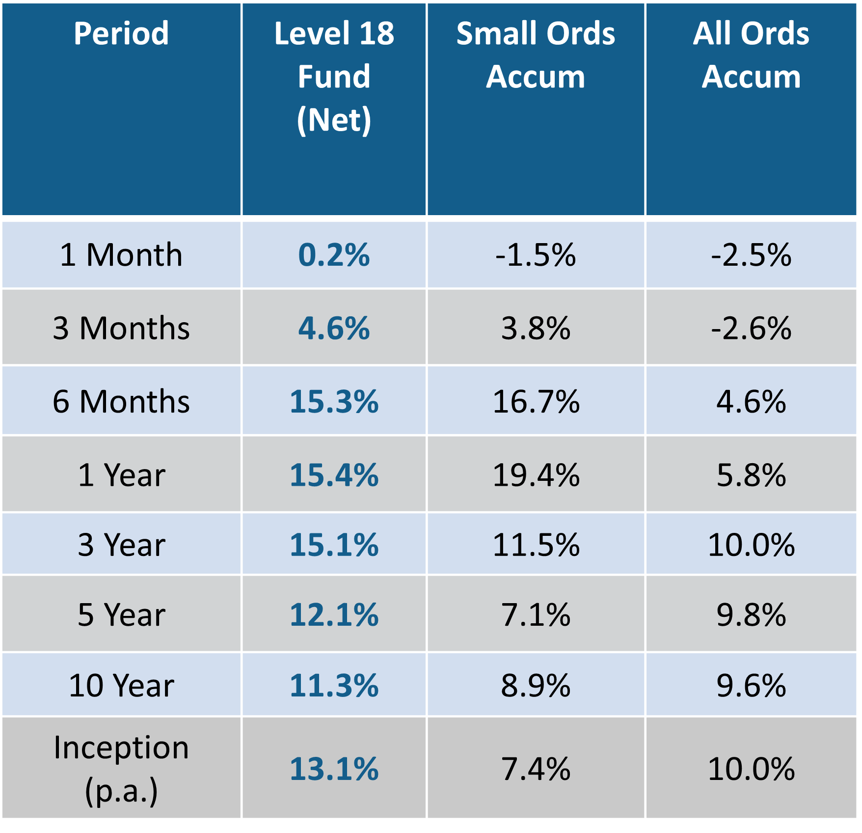 The Level 18 Fund increased by +0.2 per cent net of fees for the month.