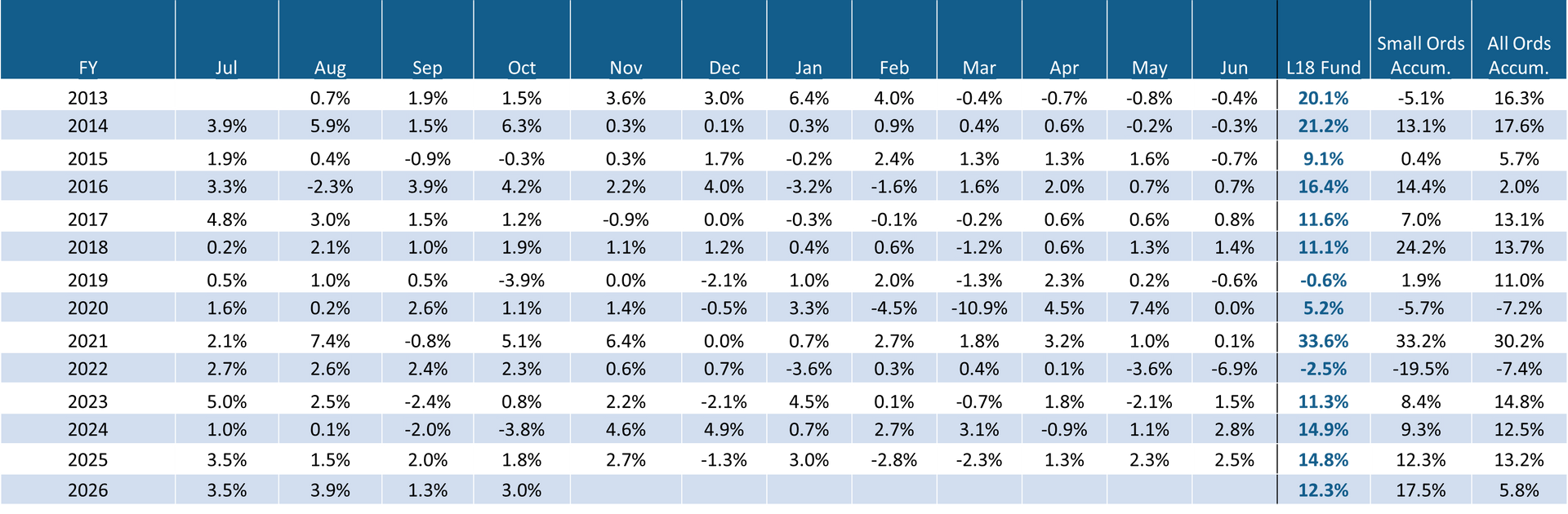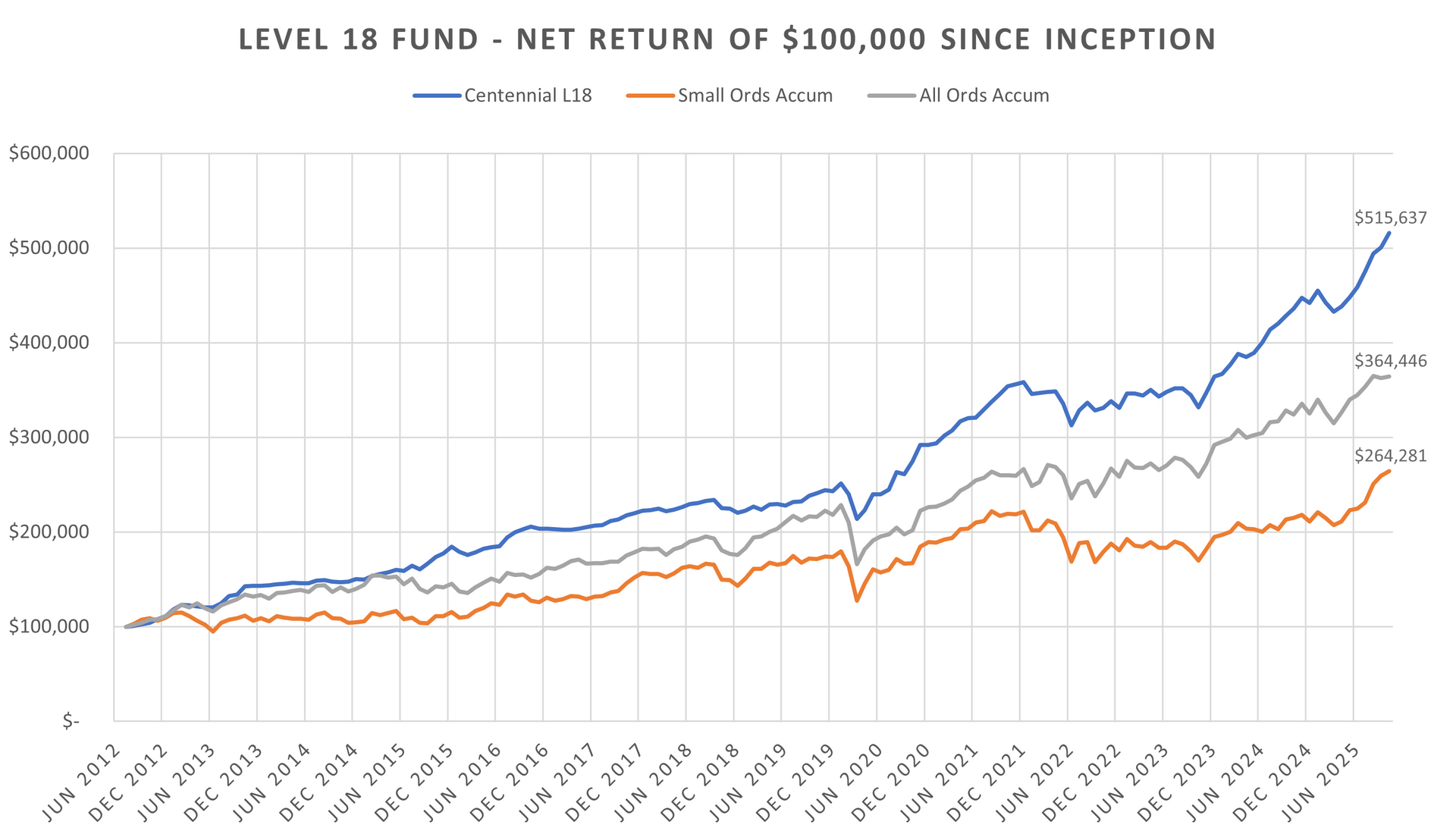The Centennial Level 18 Fund recently reached its 13th year milestone. The Fund’s flexible mandate protects capital in bad markets and delivers performance in rising markets. Since inception (2012), the Fund has delivered a +13.2 per cent net return per annum versus the All-Ordinaries Accumulation Index at +10.3 per cent and the S&P/ASX Small Ordinaries Accumulation Index at +7.6 per cent.