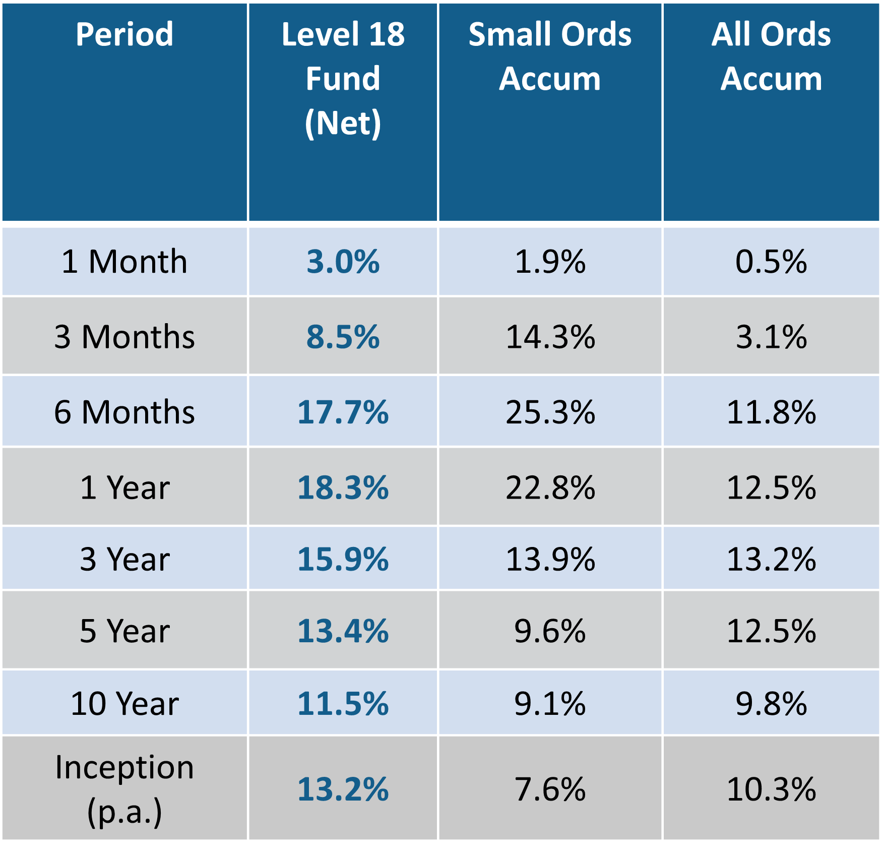 The Level 18 Fund increased by +3.0 per cent net of fees for the month.